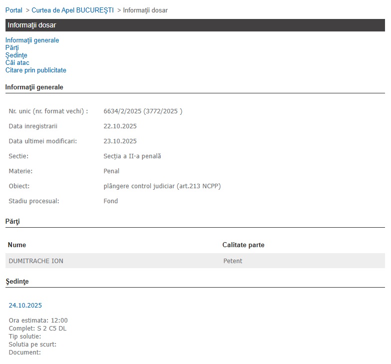 Un termen important are loc la Curtea de Apel București, unde Ion Dumitrache a fost citat în cursul acestei zile, 24.10.2025!