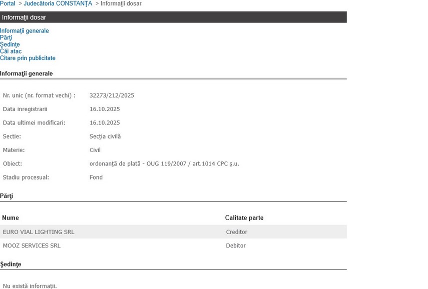 Obiectul procesului este „ordonanță de plată”, ceea ce denotă că Mooz Services SRL ar avea datorii față de creditorul Euro Vial Lighting SRL, acesta din urmă încercând să-și recupereze creanțele pe cale judiciară.