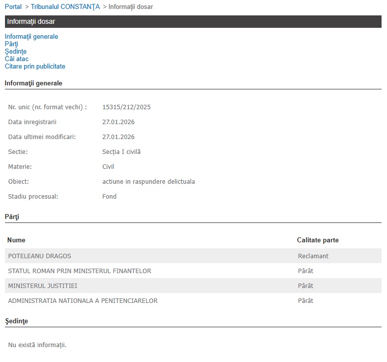 Astfel, Poteleanu s-a îndreptat în instanță împotriva Ministerului Finanțelor, Ministerului Justiției și a Administrației Naționale a Penitenciarelor, în dosarul cu indicativul 15315/212/2025, care a fost recent înregistrat pe rolul Secției I Civile a Tribunalului Constanța.