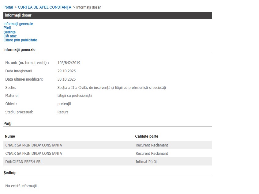 La Tribunalul Constanța se află dosarul cu nr. 103/842/2019, părțile implicate fiind CNAIR SA, prin DRDP Constanța, în calitate de reclamant și Danclean Fresh SRL, ca pârât.