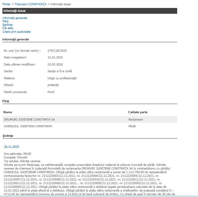 Tribunalul Constanța a admis, în 26 noiembrie 2025, acțiunea formulată de Drumuri Județene Constanța SA împotriva Consiliul Județean Constanța, obligând instituția publică la plata sumei de 1.112.794,90 lei, reprezentând contravaloarea unor facturi emise în decembrie 2021.