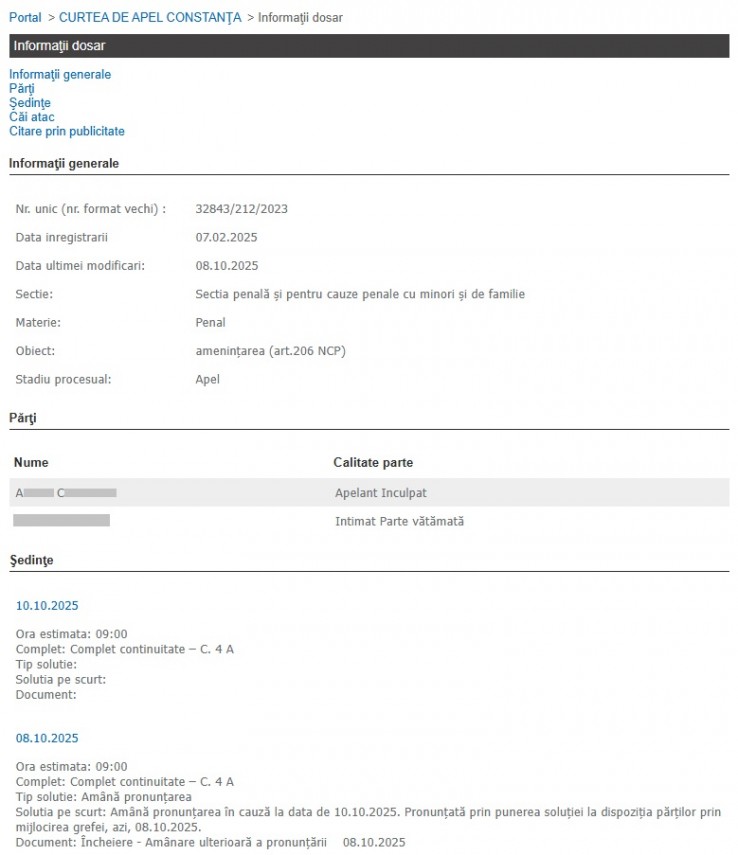 Hotărârea Judecătoriei Constanța a fost contestată de inculpat, iar dosarul a ajuns pe masa magistraților Curții de Apel Constanța. După o cauză și alte 4 pronunțări amânate, Curtea de Apel Constanța ar putea încheia dosarul, întrucât instanța superioară a stabilit ca la data de 10.10.2025 să ofere pronunțarea!