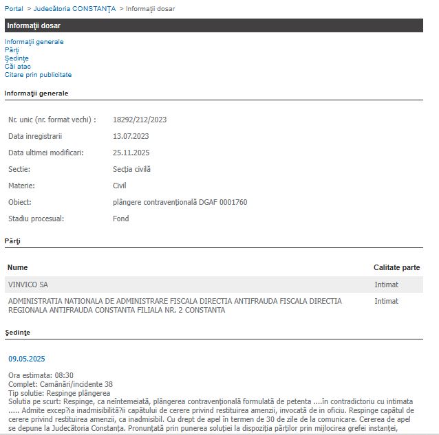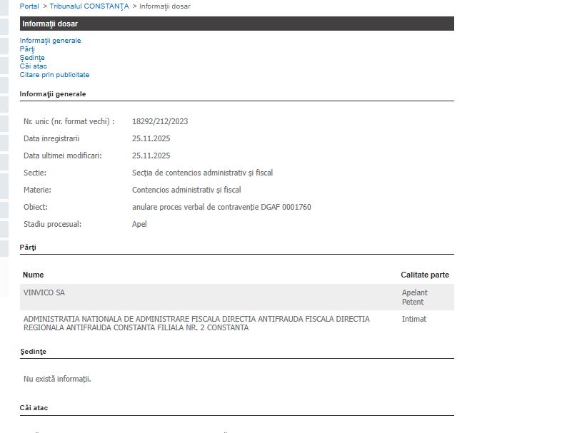 Dosarul nr. 18292/212/2023, înregistrat la data de 13.07.2023 , în care Vinvico SA contestă un proces-verbal de contravenție emis de Direcția Generală Antifraudă Fiscală (DGAF) – Filiala Regională Constanța nr. 2, a fost înregistrat în etapa de apel pe rolul Tribunalului Constanța, la Secția de contencios administrativ și fiscal.