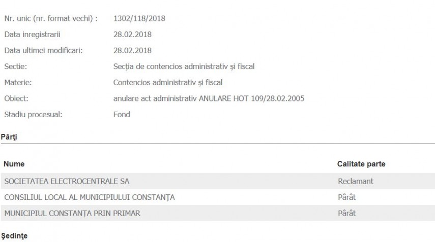 În ultima zi a lunii februarie, Electrocentrale SA a chemat la judecată Consiliul Local Constanța și municipalitatea prin primar. Dosarul cu nr. 1302/118/2018 are ca obiect anulare act administrativ, anulare hotărâre 109/28.02.2005. Dosarul a fost înregistrat pe rolul Secției de contencios administrativ și fiscal a Tribunalului Constanța.Potrivit paginii web a municipalității, hotărârea 109/28.02.2005 adoptată de Consiliul Local Municipal vizează centralizarea inventarului bunurilor care aparțin domeniului privat al municipiului Constanța. Președinte de ședință la adoptarea acestei hotărâri era Nicolae Moga, actual senator PSD.