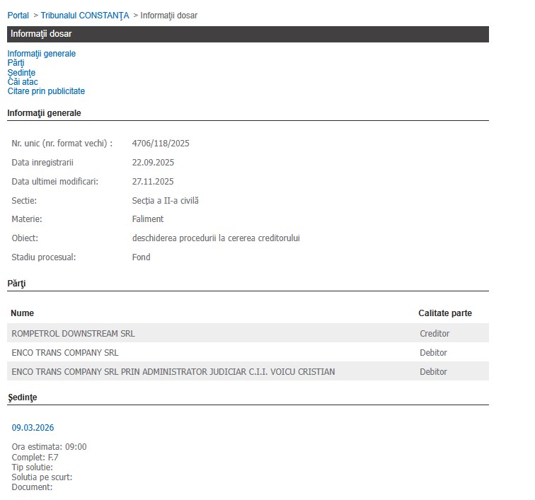 Primul termen în proces a fost pe 10.11.2025, când instanța a amânat pronunțarea, iar următorul a avut loc pe 24.11.2025, dată la care a fost admisă cererea formulată de creditoarea Rompetrol Downstream SRL în contradictoriu cu debitoarea Enco Trans Company SRL.