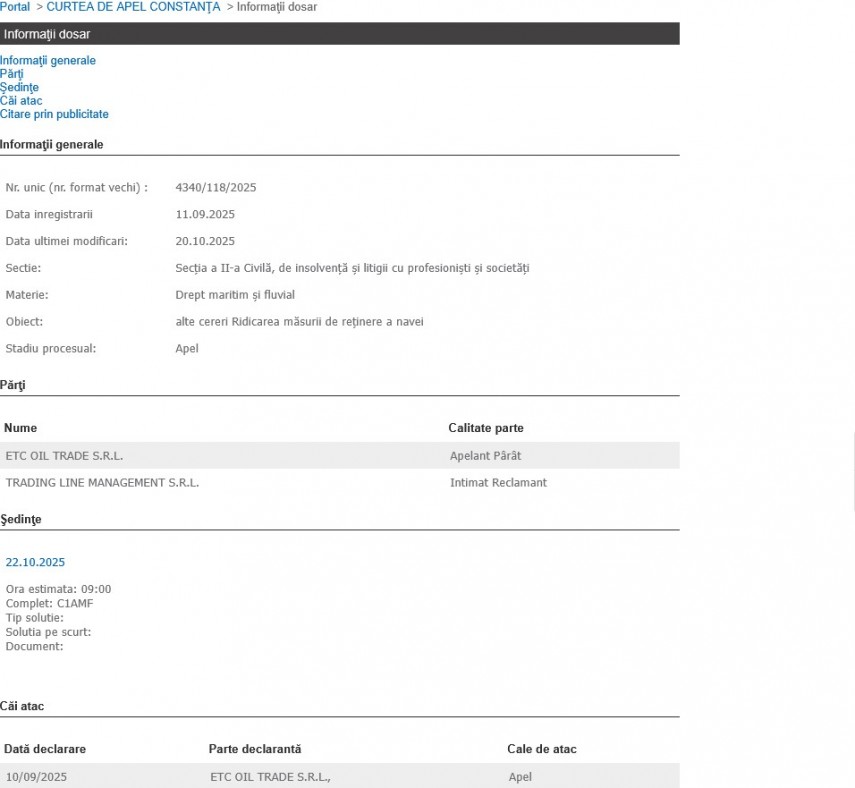 După cum se arată pe Portalul Instanțelor de Judecată, apelul a fost declarat la data de 10 septembrie a.c. de ETC Oil Trade SRL, în urma deciziei Tribunalului Constanța de a ridica măsura de reținere în Portul Constanța a navei „Navitas”, proprietatea Trading Line Management SRL.
