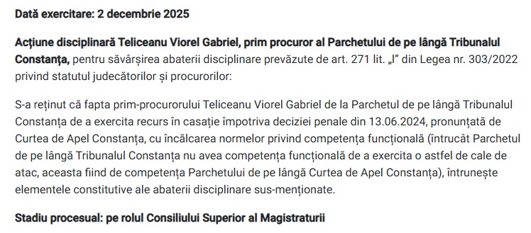 Drept urmare, la data de 2 decembrie 2025, Inspecția Judiciară a anunțat demararea procesului disciplinar în cadrul Consiliului Superior al Magistraturii.