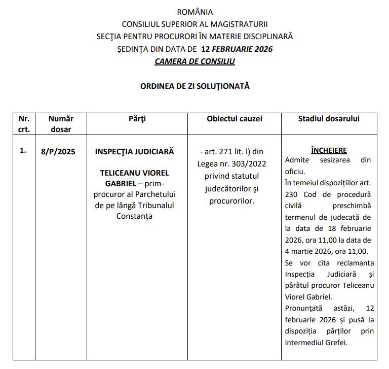 Ulterior, la data de 12.02.2026, Consiliul Superior al Magistraturii a anunțat că termenul de judecată în cadrul Secției pentru Procurori în materie disciplinară a fost preschimbat de la data de 18 februarie2026 la data de 4 martie 2026.