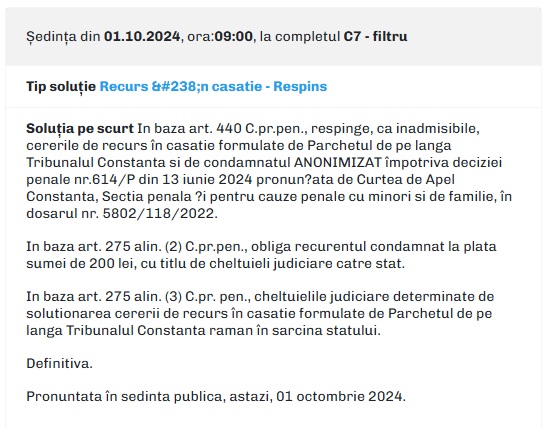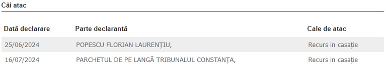 Potrivit datelor publicate pe Portalul Instanțelor de Judecată, Parchetul de pe lângă Tribunalul Constanța și inculpatul au formulat recurs în casație împotriva deciziei Curții de Apel Constanța nr. 614/2024 din data de 13.06.2024.