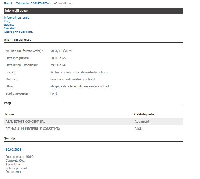A fost stabilit termen azi,10 februarie la Tribunalul Constanța în dosarul 5064/118/2025 în care Real Estate Concept SRL,firmă imobiliară din Constanța dă în judecată primarul municipiului pentru emiterea unui act administrativ. Potrivit Portalului Instanțelor de Judecată, a fost stabilită ora estimată pentru ședință ora 10.00, complet CA1.