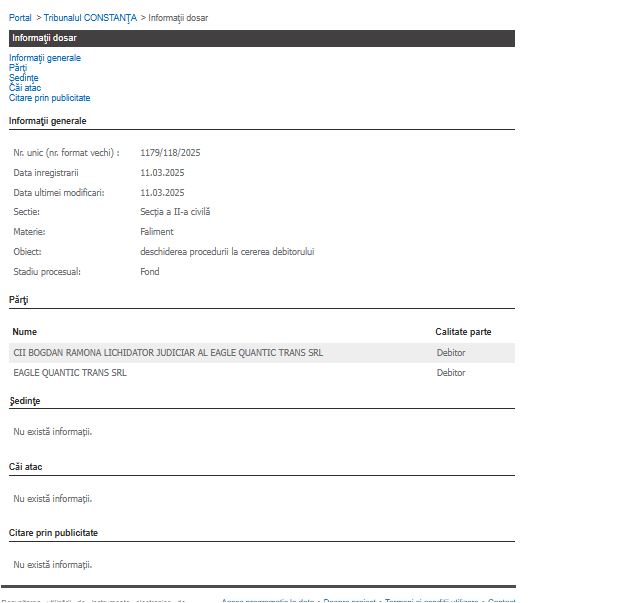- Dosarul 1179/118/2025, depus la Tribunalul Constanța, are ca obiect deschiderea procedurii de faliment la cererea debitorului Eagle Quantic Trans SRL.