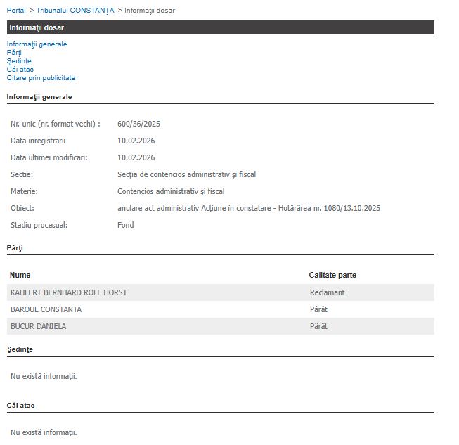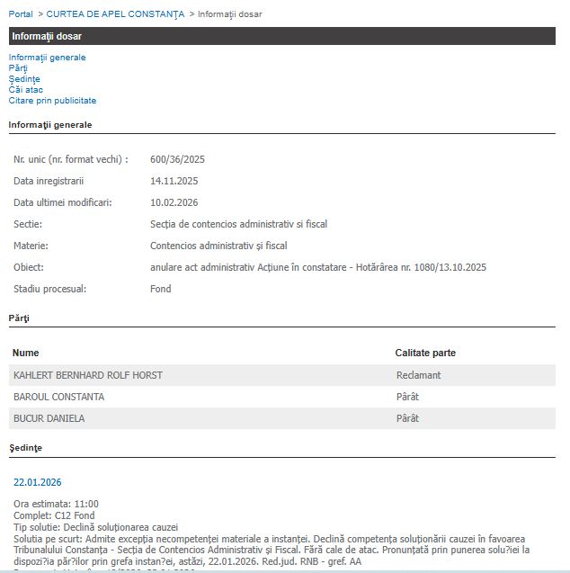 Acesta a înregistrat anul trecut pe rolul Tribunalului Constanța, secția civilă dosarul cu număr unic 4341/118/2024 care are ca obiect o acțiune în răspundere delictuală.