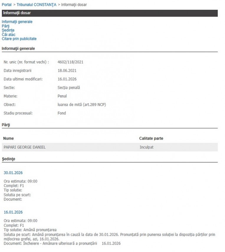 - Tribunalul Constanța ar putea anunța o decizie cu privire la dosarul DNA în care George Daniel Papari, fostul director al Administrației Naționale „Apele Române” – Direcția Apelor Dobrogea Litoral (ABADL), este suspectat de luare de mită.