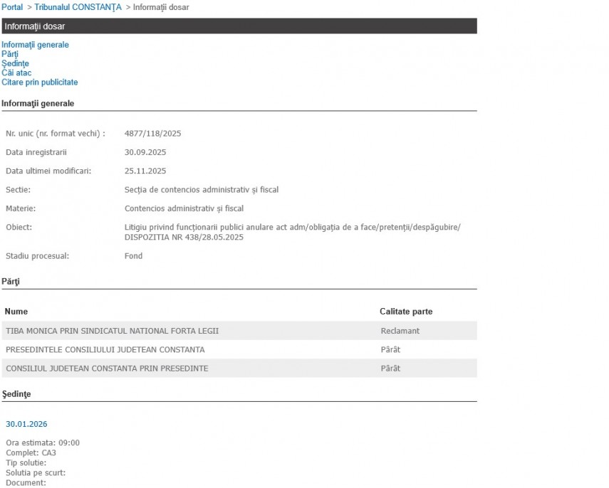 Potrivit Portal Just, Tribunalul Constanța va judeca litigiul la data de 30 ianuarie 2026, cauza fiind în atenția completului CA3.
