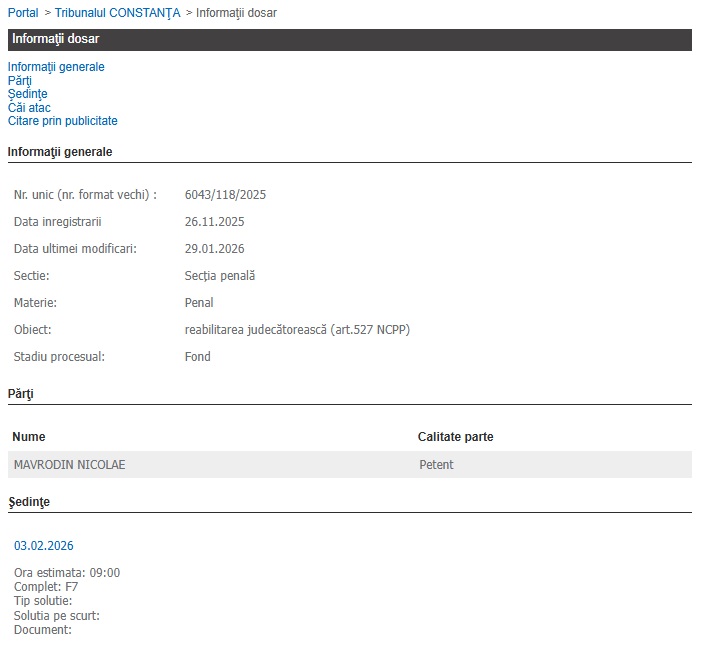Mai precis, potrivit Portalului Instanțelor de Judecată, în dosarul cu indicativul 6043/118/2025, magistrații ar putea stabili dacă Nicolae Mavrodin, condamnat, în anul 2016, la 7 ani de închisoare pentru evaziune fiscală, delapidare, fals în înscrisuri sub semnătură privată şi fals în declaraţii, dacă va scăpa sau nu de cazier.