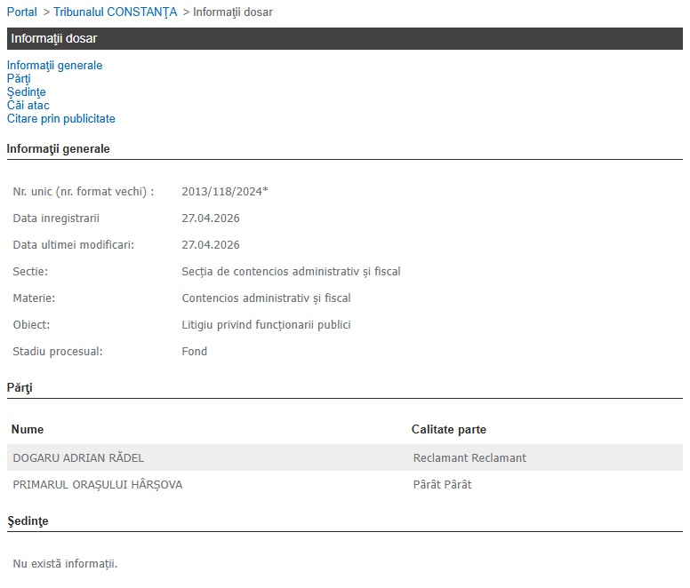 După ce Curtea de Apel Constanța a dispus rejudecarea cauzei, potrivit Portalului Instanțelor de Judecată, dosarul cu indicativul 2013/118/2024*a fost înregistrat pe Secţia de contencios administrativ şi fiscal luni, 27.04.2026.