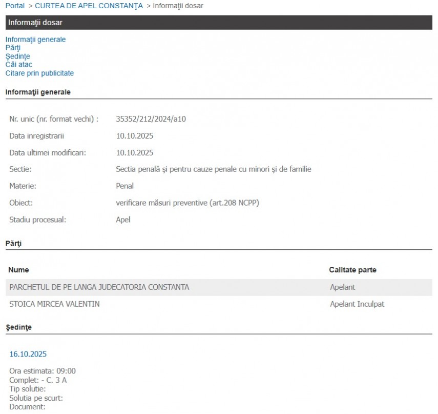 În cazul celor doi, la sfârșitul lunii mai 2025, Judecătoria Constanța a dictat peste 5 ani de închisoare pentru un inculpat, ținând cont și de faptul că inculpatul Stoica Mircea Valentin ar fi comis faptele în vreme ce se afla sub termen de supraveghere, într-o altă condamnare primită tot la Judecătoria Constanța, rămasă definitivă prin neapelare, în timp ce pe numele celui de-al doilea, respectiv Anița Sebastian Marian, a fost stabilită o pedeapsă de 1 an și 9 luni de închisoare cu suspendare, sub termen de supraveghere de 3 ani.