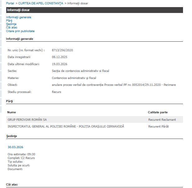 Curtea de Apel Constanța analizează astăzi, 30 martie 2026, un al doilea dosar de contencios administrativ ce implică Grup Feroviar Român (GFR) SA și Poliția Orașului Cernavodă.