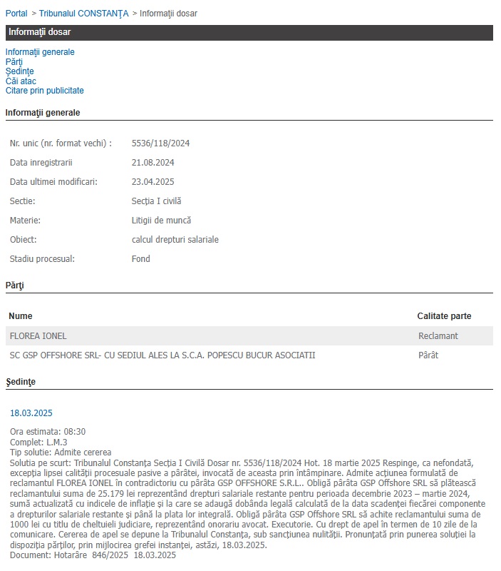 - Dosarul cu indicativul 5536/118/2024, în care Tribunalul a dat câștig de cauză lui Florea Ionel, căruia GSP Offshore are de achitat salarii restante din perioada decembrie 2023 – martie 2024 în cuantum de 25.179 lei și 1.000 lei cu titlu de cheltuieli judiciare (onorariu avocat).