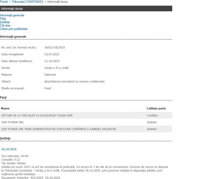 GSP Power SRL a fost vizată de o cerere de intrare în insolvență. Cum s-a încheiat procesul de la Tribunalul Constanța