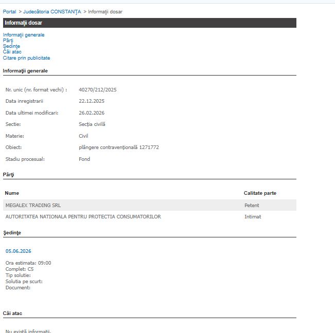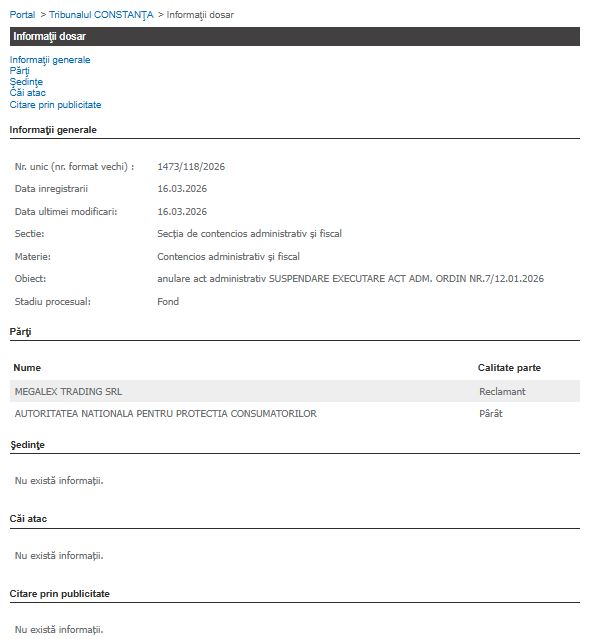 Cel mai recent dosar, 1473/118/2026, înregistrat pe 16.03.2026, are ca obiect suspendarea executării Ordinului Nr. 7/12.01.2026 emis de ANPC. Această acțiune este vitală pentru Megalex Trading SRL, deoarece o măsură de suspendare ar permite continuarea activității fără restricțiile impuse de autoritate până la judecarea pe fond a cauzei.