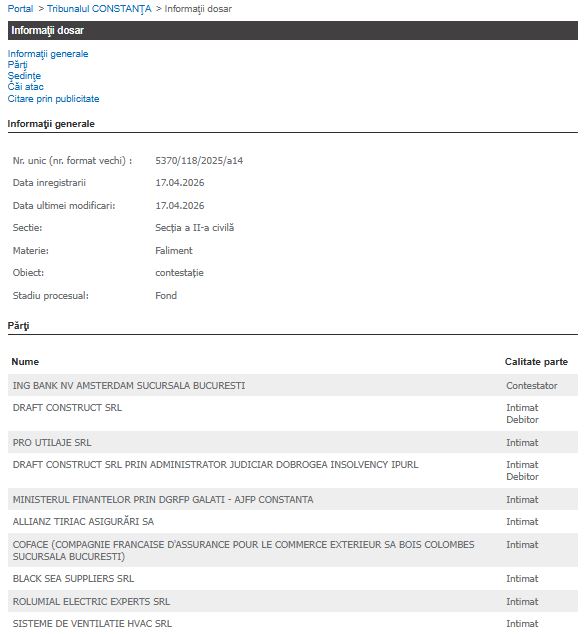 Recent, pe rolul Secției a II-a Civilă a Tribunalului Constanța, a fost înregistrat un nou dosar (nr. 5370/118/2025/a14) având ca obiect o contestație formulată de creditorul ING Bank NV Amsterdam – Sucursala București.Printre intimații din dosar se numără nume importante din sectorul asigurărilor și al distribuției de materiale, precum Allianz Tiriac Asigurări SA, Coface, Black Sea Suppliers SRL și Rolumial Electric Experts SRL. De asemenea, în cauză este citat și Ministerul Finanțelor prin AJFP Constanța, în calitate de creditor instituțional.