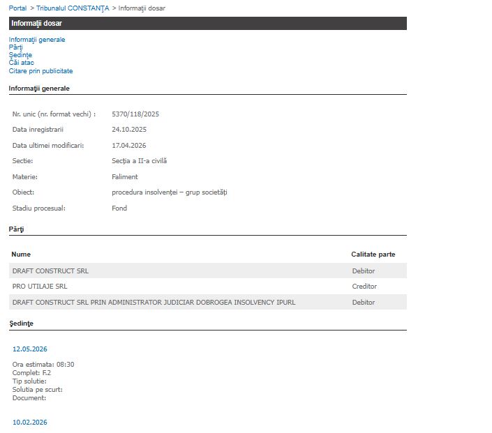 Procedura de insolvență a societății Draft Construct SRL intră într-o nouă etapă procedurală. Tribunalul Constanța, prin Secția a II-a Civilă, a stabilit un nou termen de judecată pentru data de 12 mai 2026, după ce dosarul a parcurs mai multe faze administrative de la deschiderea acestuia în toamna anului trecut.