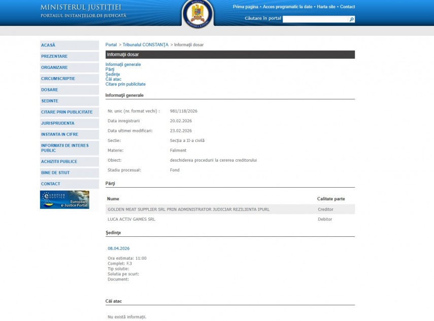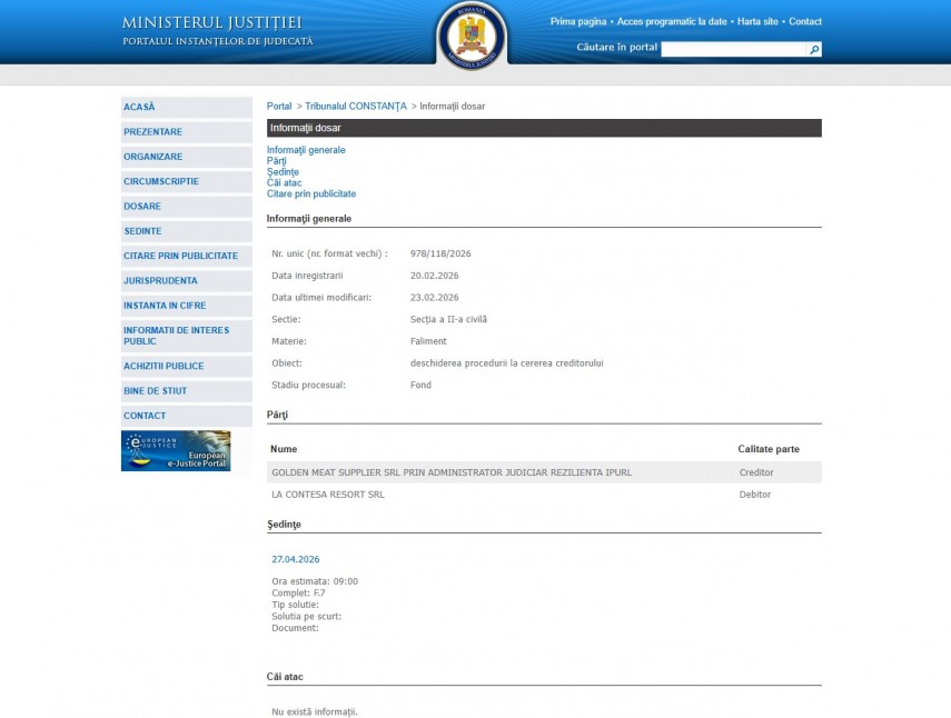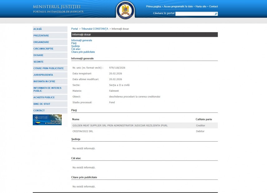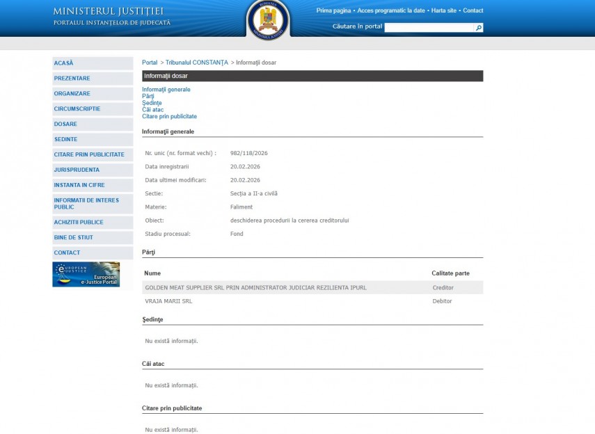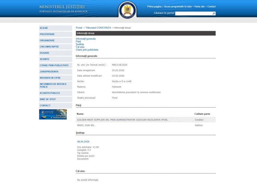 Justiție ConstanțaDecizie definitivă la Curtea de Apel Constanța în dosarul de insolvență a societății Golden Meat Suppliers SRL, o afacere de 21.5 milioane lei