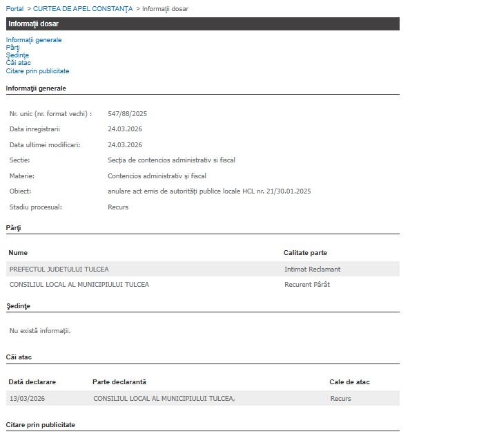Consiliul Local Tulcea nu a acceptat sentințele și a declarat deja recurs în toate cele trei cauze în perioada 13-16 martie 2026. Dosarele au fost transferate recent, pe 24 martie 2026, la Curtea de Apel Constanța, unde se va judeca faza finală a proceselor.
