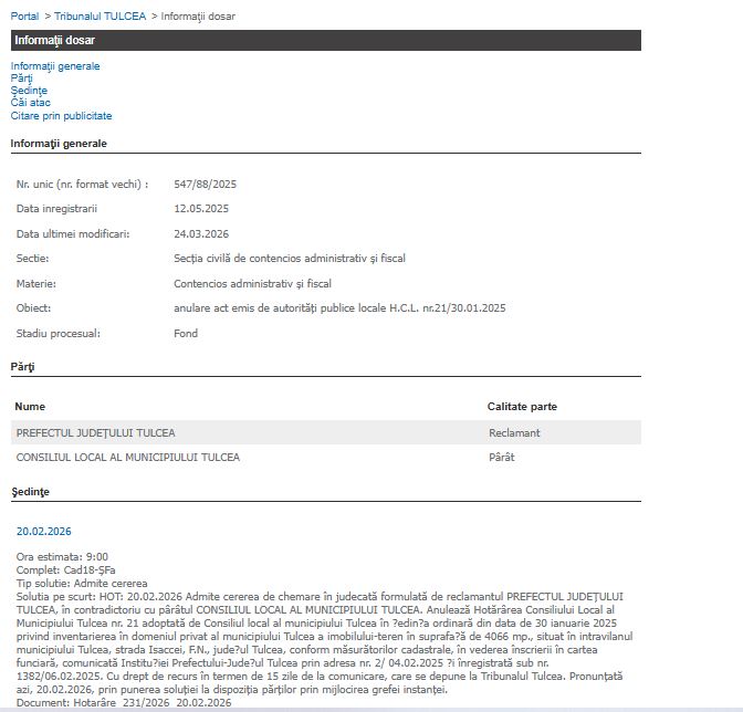 Tribunalul Tulcea a admis cererile formulate de Prefectul Județului Tulcea împotriva Consiliului Local al Municipiului Tulcea, anulând trei hotărâri (HCL) prin care mai multe terenuri din oraș fuseseră trecute în domeniul privat al municipiului. Deciziile instanței de fond, pronunțate la data de 20 februarie 2026, vizează suprafețe importante de teren situate pe străzile Isaccei, Portului și Barajului.