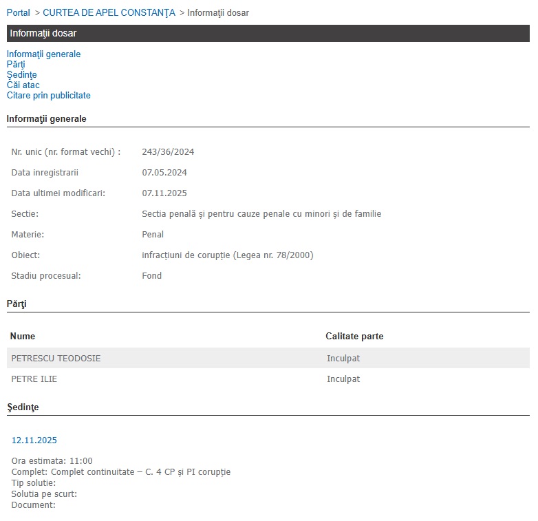 ÎPS Teodosie și Petre Ilie au fost citați la un nou termen desfășurat astăzi, 12.11.2025, la Curtea de Apel Constanța, într-un dosar care are ca obiect „infracțiuni de corupție”.