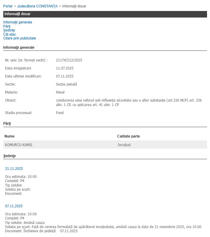 Astfel, acesta ar fi fost trimis în judecată, în dosarul cu indicativul 21174/212/2025, care are ca obiect conducerea unui vehicul sub influenţa alcoolului sau a altor substanţe (art.336 NCP) art. 336 alin. 1 CP, cu aplicarea art. 41 alin. 1 CP.