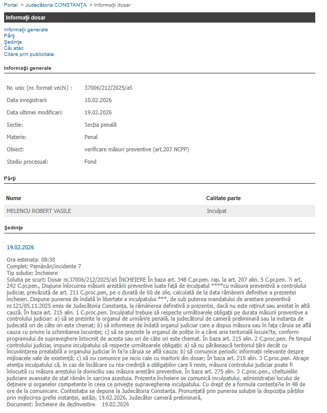 Potrivit Portalului Instanțelor de Judecată, joi, 19.02.2026, magistrații au stabilit ca Melencu Robert Vasile să fie plasat sub control judiciar.