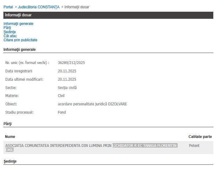 Pe rolul Judecătoriei Constanța se află dosarul cu nr. 36289/212/2025 din data de 20.11.2025, cu obiectul „acordare personalitate juridică dizolvare”, la secția civilă.