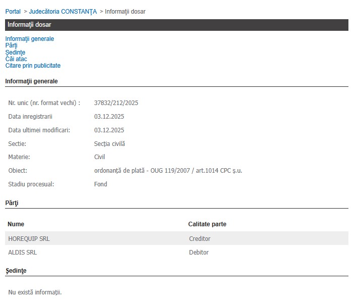 Potrivit informațiilor de pe Portal Just, pe rolul Judecătoriei Constanța s-a înregistrat la data de 03.12.2025, pe secția civilă, dosarul nr. 37832/212/2025, cu obiectul „ordonanţă de plată - OUG 119/2007 / art.1014 CPC ş.u”.