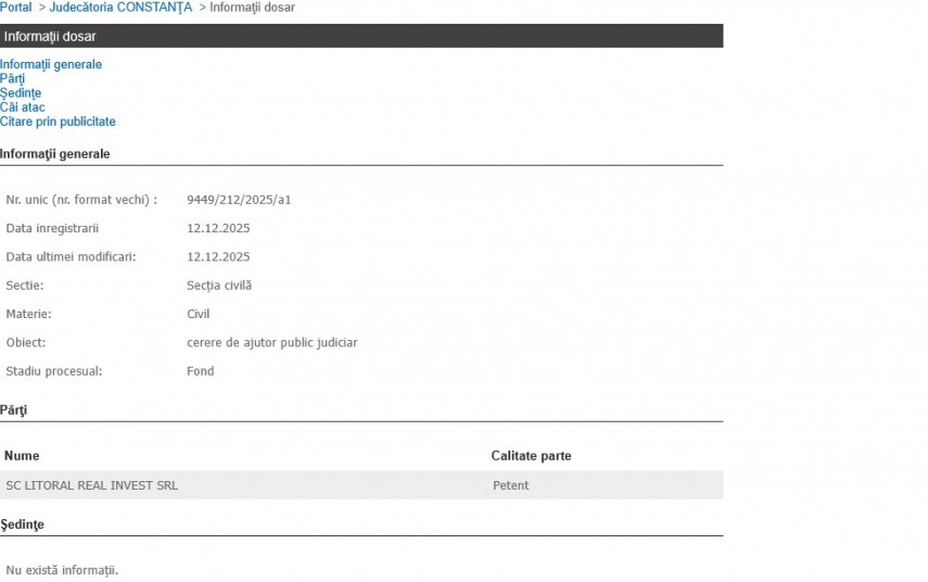 Pe rolul Judecătoriei Constanța, la data de 12 decembrie a.c., a fost înregistrată cererea de ajutor public judiciar formulată de SC Litoral Real Invest SRL.