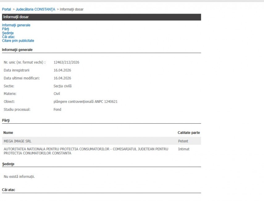 Un nou litigiu între un mare retailer și autoritățile de protecție a consumatorilor a fost înregistrat pe rolul Judecătoriei Constanța. Dosarul cu nr. unic 12463/212/2026, deschis la data de 16 aprilie 2026, vizează o plângere contravențională formulată de Mega Image SRL împotriva unei sancțiuni aplicate de Autoritatea Națională pentru Protecția Consumatorilor, prin Comisariatul Județean Constanța.