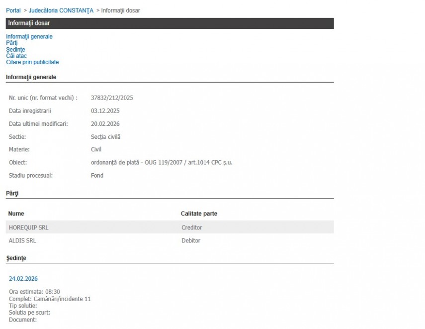 Părți în proces sunt Horequip SRL, în calitate de creditor și Aldis SRL, în calitate de debitor, iar stadiul procesual este pe fond.