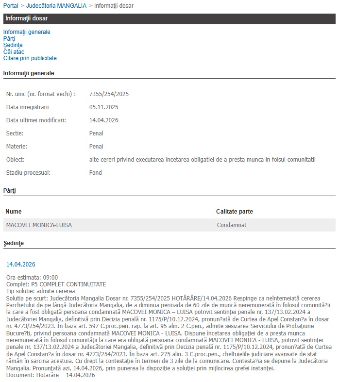 Potrivit Portalului Instanțelor de Judecată, în dosarul cu indicativul 7355/254/2025 instanța a decis încetarea obligaţiei de a presta munca neremunerată în folosul comunităţii la care a fost obligată Monica Macovei, după ce a primit o condamnare, în urma unui accident soldat cu rănirea unui motociclist.