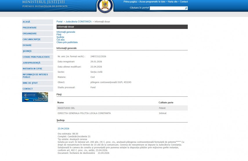 Pe rolul Judecătoriei Constanța a fost înregistrat dosarul 2487/212/2026 la data de 29 ianuarie 2026. Dosarul a fost înregistrat la Secția Civilă și are ca obiect „ plângere contravenţională DGPL 453245 “. Dosarul este în stadiul procesual – fond și ultima modificare a fost efectuată la data de 29 ianuarie 2026.Părți în dosar sunt Masstudio SRL – petent și Direcția Generală Poliția Locală Constanța – intimat.