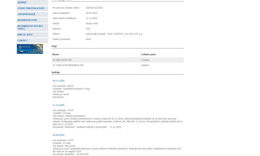 Pe rolul Judecătoriei Constanța se află dosarul 15619/212/2025, înregistrat la data de 29 mai 2025 la Secţia Civilă ce are ca obiect „ ordonanţă de plată - OUG 119/2007 / art.1014 CPC ş.u. “. Procesul se află în stadiul de fond, iar ultima modificare a fost operată în data de 25 august 2025.Părți în dosar sunt SC MBC Auto SRL – creditor și SC Star Auto Business SRL – debitor.