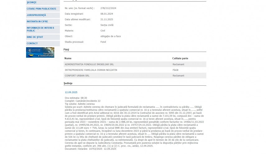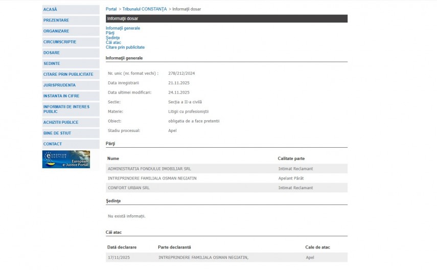 Pe rolul Tribunalului Constanța se află dosarul cu numărul de înregistrare 278/212/2024 înregistrat la data de 21 noiembrie 2025 la Secția a II-a Civilă. Dosarul are ca obiect - obligația de a face pretenții și se află în stadiul procesual de apel.Părți în dosar sunt Administratia Fondului Imobiliar SRL - Intimat Reclamant, Intreprindere Familială Osman Negiatin - Apelant Pârât și Confort Urban SRL - Intimat Reclamant.