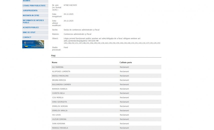Amintim că un alt dosar, La Tribunalul Constanța a fost înregistrat pe 18 decembrie 2025 un dosar în materia contenciosului administrativ și fiscal, având ca obiect litigii privind funcționarii publici și suspendarea mai multor acte administrative. Dosarul, cu numărul unic 6558/118/2025, se află în stadiul de fond și este gestionat de Secția de contencios administrativ și fiscal.