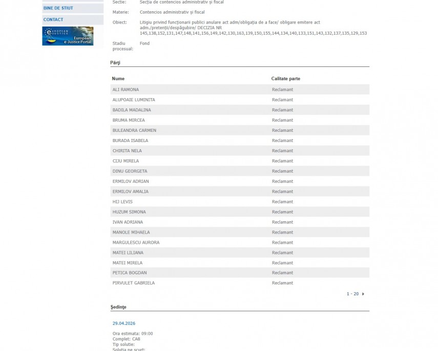 Amintim că un alt dosar, La Tribunalul Constanța a fost înregistrat pe 18 decembrie 2025 un dosar în materia contenciosului administrativ și fiscal, având ca obiect litigii privind funcționarii publici și suspendarea mai multor acte administrative. Dosarul, cu numărul unic 6558/118/2025, se află în stadiul de fond și este gestionat de Secția de contencios administrativ și fiscal.Reclamanți sunt Ali Ramona, Alupoaie Luminița, Badila Madalina, Bruma Mircea, Buleandra Carmen, Burada Isabela, Chirița Nela, Ciju Mirela, Dinu Georgeta, Ermilov Adrian, Ermilov Amalia, Hij Levis, Huzum Simona, Ivan Adriana, Manole Mihaela, Mărgulescu Aurora, Matei Liliana, Matei Mirela, Petica Bogdan, Pîrvuleț Gabriela, Potecasu Elena, Radut Claudia, Spataru Gabriela, Stici Simona, Tănase Chirata, Taranu Mariana, Tudose Elena, Vlad Adelina, toți contestând deciziile administrative iar pârât este Agenția Județeană de Ocupare a Forței de Muncă Constanţa.