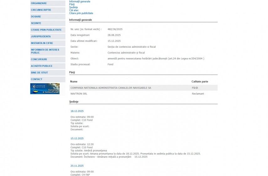 Părți în dosar sunt Compania Națională Administrația Canalelor Navigabile SA – pârât și NAVTRON SRL – reclamant.Primul termen în acest dosar a fost fixat pentru data de 11 septembrie 2025. Din cauza acțiunii de protest a magistraților, a fost amânat procesul pentru data de 6 noiembrie. La termenul din 6 noiembrie, instanța a amânat pronunțarea la 11.11.2025, pentru a se depune concluzii scrise.
