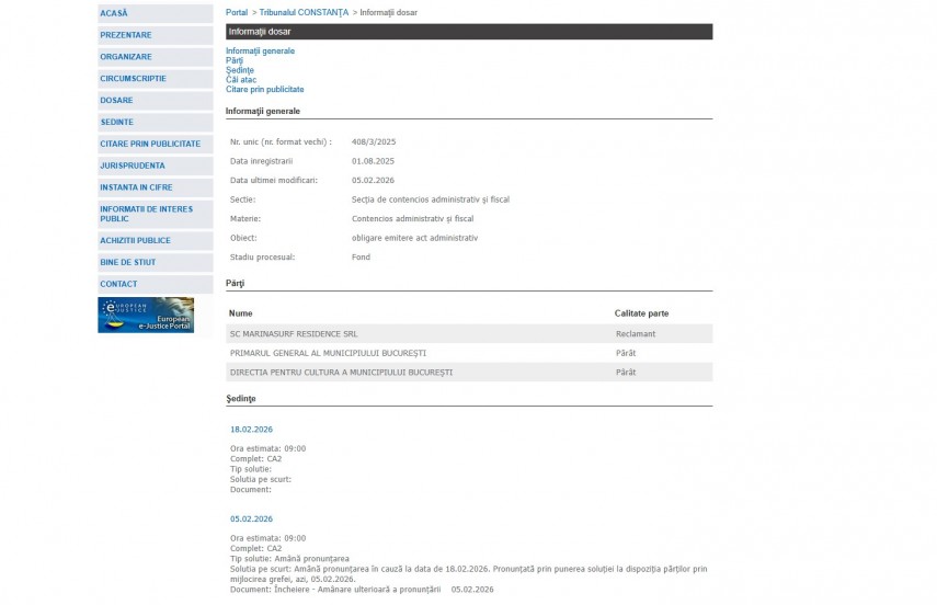 Pe rolul Tribunalului Constanța a fost înregistrat dosarul 408/3/2025 la data de 1 august 2025. Dosarul a fost înregistrat la Secţia de contencios administrativ si fiscal și are ca obiect „obligare emitere act administrativ“. Dosarul este în stadiul procesual – fond și ultima modificare a fost efectuată la data de 18 februarie2026.Părți în dosar sunt SC Marinasurf Residence SRL – Reclamant, Primarul General al Municipiului Bucureşti – Pârât și Direcția pentru Cultură a Municipiului Bucureşti –Pârât.