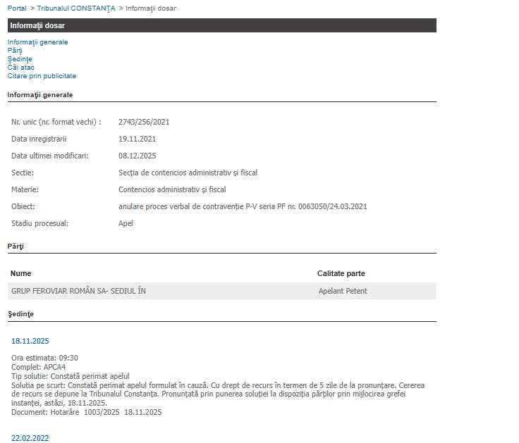 Justiție Constanța Amenzi pentru neasigurarea pazei trenurilor. Grup Feroviar Român SA atacă procese-verbale vechi de cinci ani