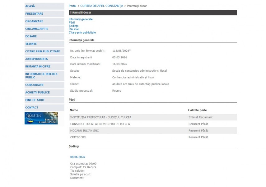 Pe rolul Curții de Apel Constanța a fost înregistrat la data de 3 martie 2026 dosarul cu numărul de înregistrare 113/88/2024* la Secția de Contencios Administrativ și Fiscal. Dosarul are ca obiect „anulare act emis de autorități publice locale“, stadiul acestuia fiind recurs.Părți în dosar sunt Instituția Prefectului Județului Tulcea – Intimat Reclamant, Consiliul Local al Municipiului Tulcea - recurent pârât, Mocanu Iulian SNC – recurent pârât și Criteo SRL – recurent pârât.