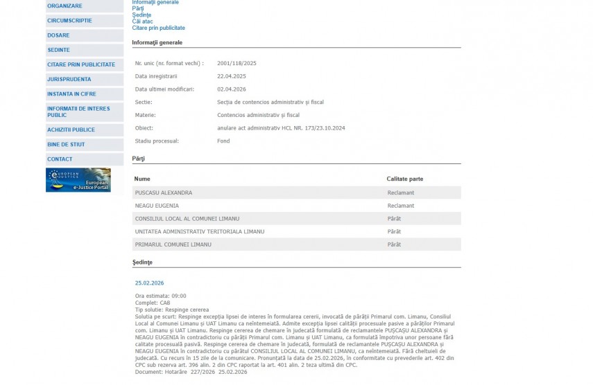 În Hotărârea Consiliului Local nr. 173/23.10.2024 se prevede preluarea contractului de concesionare nr. 5717 din 16.07.2008, de la domnul **** de către doamna **** şi doamna ****.„Solutia pe scurt: Respinge excepţia lipsei de interes în formularea cererii, invocată de pârâţii Primarul com. Limanu, Consiliul Local al Comunei Limanu şi UAT Limanu ca neîntemeiată. Admite excepţia lipsei calităţii procesuale pasive a pârâţilor Primarul com. Limanu şi UAT Limanu. Respinge cererea de chemare în judecată formulată de reclamantele PUŞCAŞU ALEXANDRA şi NEAGU EUGENIA în contradictoriu cu pârâţii Primarul com. Limanu şi UAT Limanu, ca formulată împotriva unor persoane fără calitate procesuală pasivă. Respinge cererea de chemare în judecată, formulată de reclamantele PUŞCAŞU ALEXANDRA şi NEAGU EUGENIA în contradictoriu cu pârâtul CONSILIUL LOCAL AL COMUNEI LIMANU, ca neîntemeiată. Fără cheltuieli de judecată. Cu recurs în 15 zile de la comunicare. Pronunţată la data de 25.02.2026, în conformitate cu prevederile art. 402 din CPC sub rezerva art. 396 alin. 2 din CPC raportat la art. 401 alin. 2 teza ultimă din CPC“ – conform Portalului Instanțelor de Judecată.
