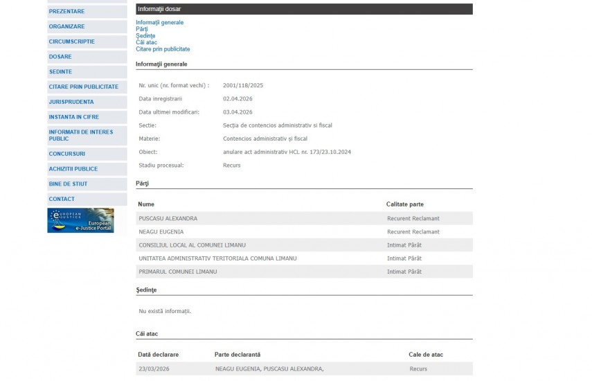 Pe rolul Curții de Apel Constanța a fost înregistrat la data de 2 aprilie 2026 dosarul 2001/118/2026. Acesta se află în atenția Secției de Contencios Administrativ și Fiscal și are obiectul „anulare act administrativ HCL nr. 173/23.10.2024 “. Stadiul procesual este recurs.Părți în dosar sunt Pușcașu Alexandra - Recurent Reclamant, Neagu Eugenia - Recurent Reclamant, Consiliul Local al Comunei Limanu - Intimat Pârât, Unitatea Administrativ Teritorială Comuna Limanu - Intimat Pârât și Primarul Comunei Limanu - Intimat Pârât.